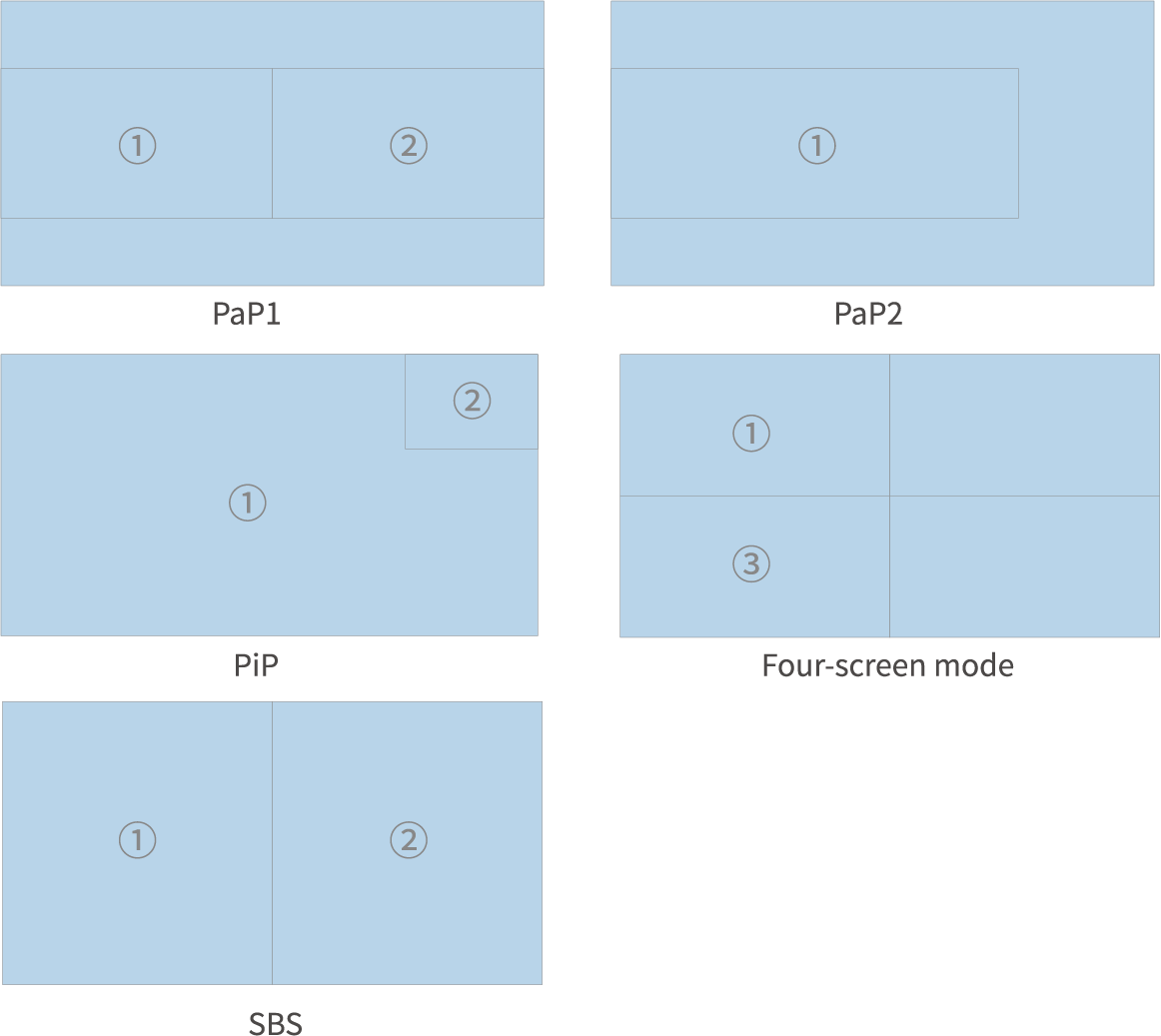 La función PaP se puede utilizar para ver dos fuentes de señal independientes simultáneamente dentro de una pantalla. Con la función de imágenes incrustadas, la segunda señal se puede mostrar por encima de la señal principal, se puede ajustar el tamaño y la posición de la ventana de imágenes incrustadas. En el modo de cuatro pantallas, cuatro fuentes de señal se pueden mostrar en la pantalla del monitor, dispuestos en forma de "田". Es muy útil cuando varias imágenes necesitan ser vistas al mismo tiempo (como múltiples modos).