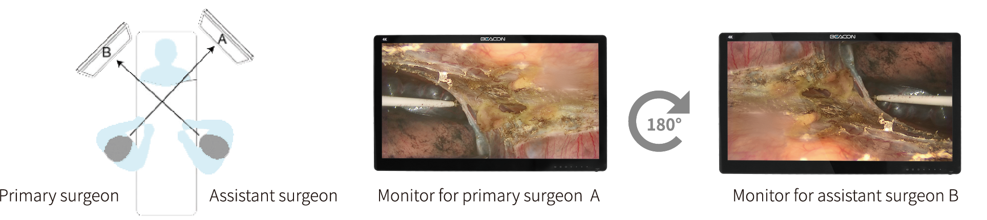 Independientemente de la orientación de la cámara quirúrgica, puede rotar o reflejar la imagen mostrada 180 grados para encontrar la visión quirúrgica perfecta, mejorando la comodidad de la sala de operaciones.